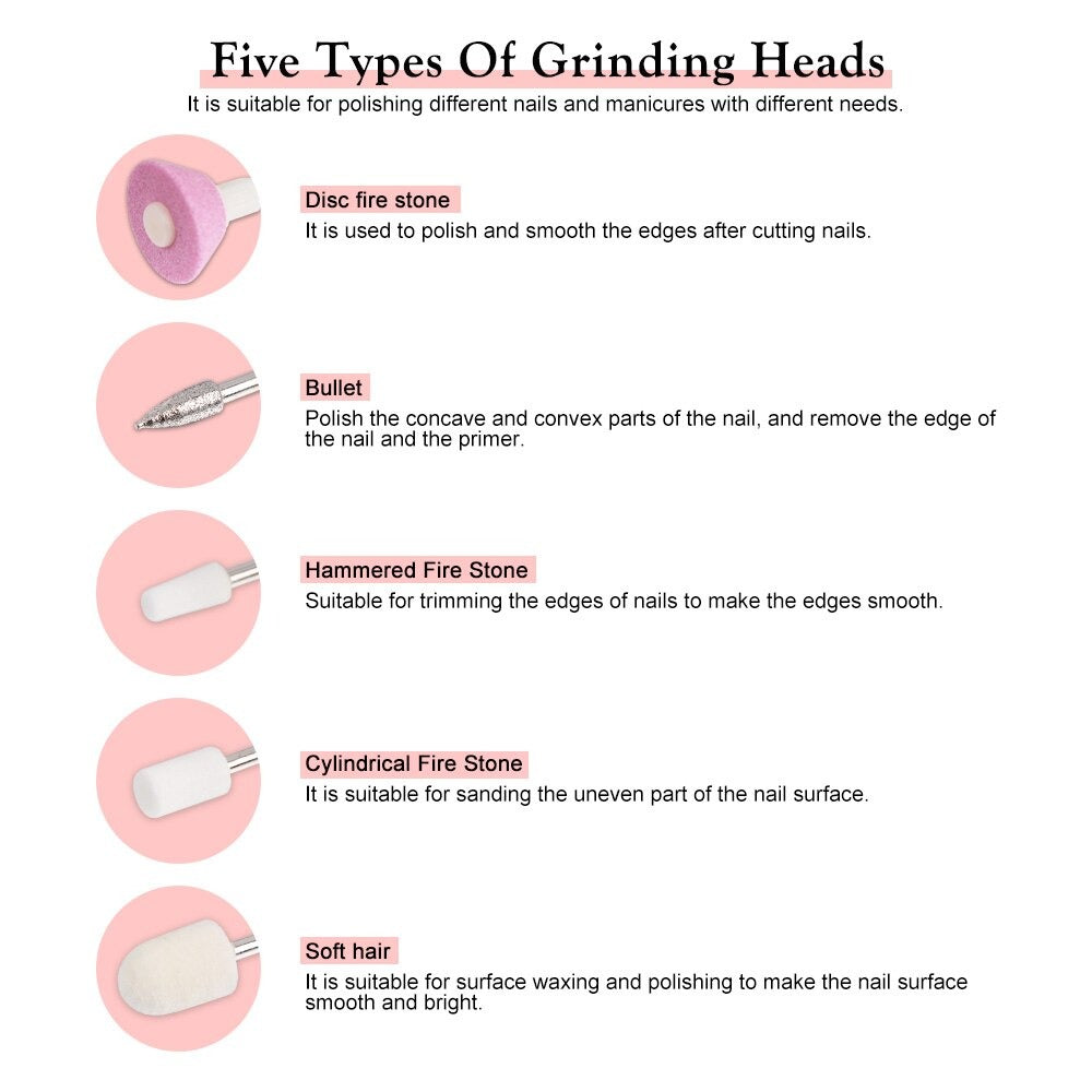 • 5 znovupoužitelných hlavic – pro pilování, tvarování, broušení, leštění a finální úpravy, abyste měli nehty každý den dokonalé.