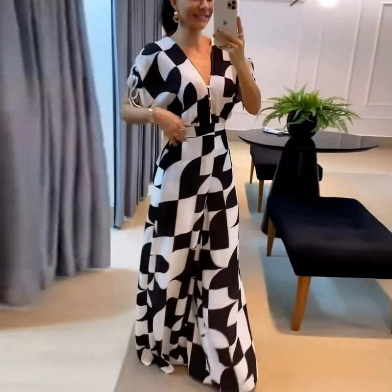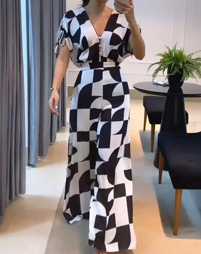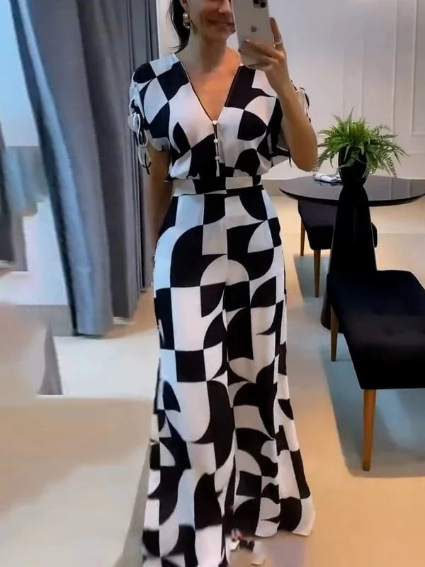 Představte si, že se oblékáte do výrazného geometrického vzoru, kde se odvážné tvary setkávají s nadčasovou černobílou – vše na látce tak jemné, jako by byla ušita přímo pro vás. Hluboký výstřih do V přidává svůdnou eleganci, zatímco široké nohavice zajišťují přirozený pohyb a opticky prodlužují postavu při každém kroku.