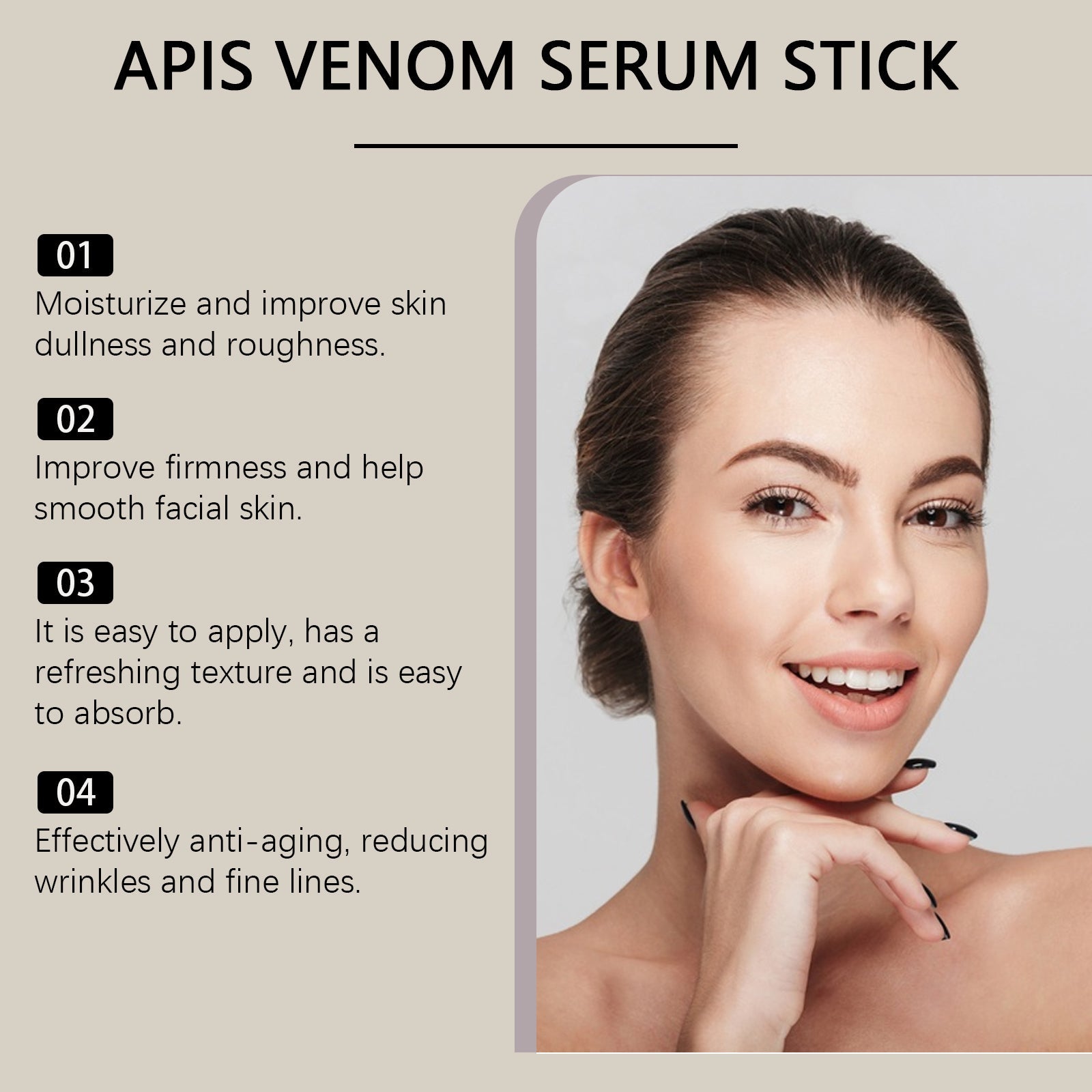 Tento sérum stick je vaše nová tajná zbraň pro pevnější a mladistvě rozzářenou pleť, která vypadá, jako byste právě prošla rychlou lázeňskou kúrou. Kombinace přírodních peptidů z včelího jedu a intenzivních hydratačních složek pomáhá vypnout, vyhladit a okamžitě probudit unavený vzhled – během několika vteřin.