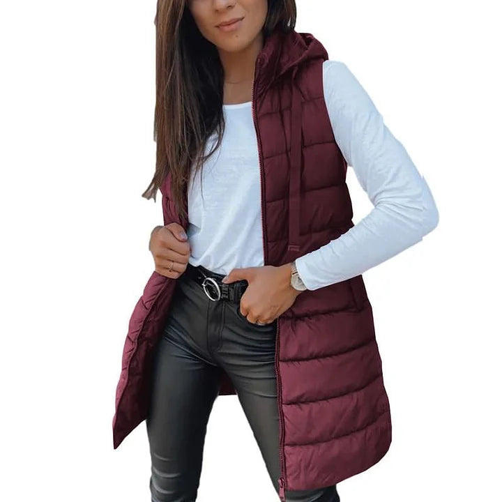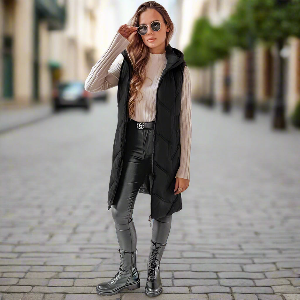 Tato vesta se stane vaším nepostradatelným společníkem na chladné dny. Tento elegantní, lehký kousek vám dodá bez námahy stylový a vrstvený vzhled, zatímco vás udrží v teple a komfortu. Dlouhý prošívaný střih lichotí vaší siluetě a kapuce přidává nádech nenuceného šarmu – ideální pro ranní procházky, víkendové kávové výlety nebo stylové městské vycházky.