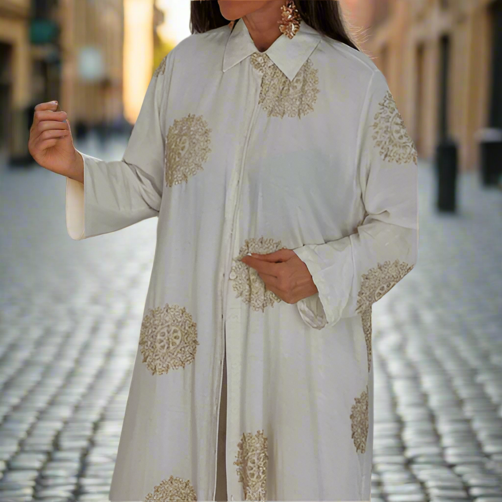 Tato dvoudílná sada nabízí nenuceně elegantní a upravený vzhled, s dlouhým pláštěm s výstřihem do V, který půvabně splývá, a kalhotami s vysokým pasem a širokými nohavicemi s výrazným potiskem, které zaručeně upoutají pozornost. Ať už si užíváte brunch nebo přicházíte na večerní akci, tento set vám zajistí, že budete zářit sebevědomím a nadčasovým stylem bez námahy.