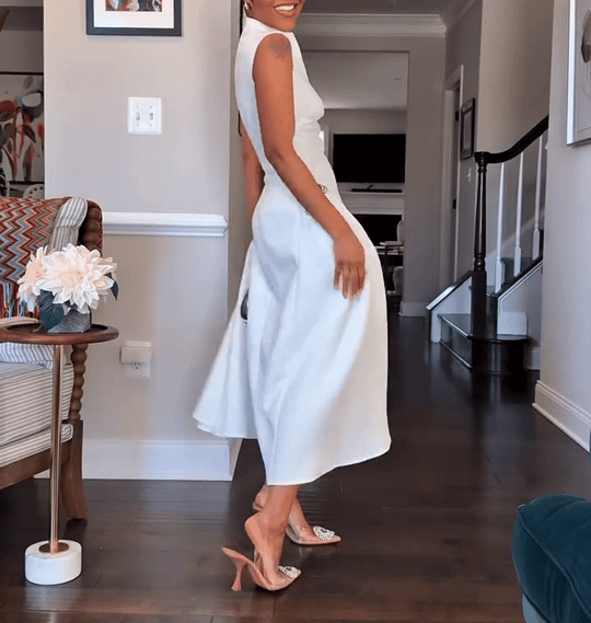Vstupte do okamžitého sebevědomí a upoutejte každý pohled ve chvíli, kdy si obléknete tyto elegantní šaty bez rukávů. Odvážný asymetrický výstřih vytváří výraznou, nezapomenutelnou siluetu, která odráží váš moderní, sofistikovaný styl. Ať už tančíte pod hvězdami, vychutnáváte si koktejly na terase, nebo přicházíte na významnou událost, tyto šaty zajistí, že budete středem pozornosti – připravená přijímat komplimenty a cítit se opravdu zářivě po celý večer.