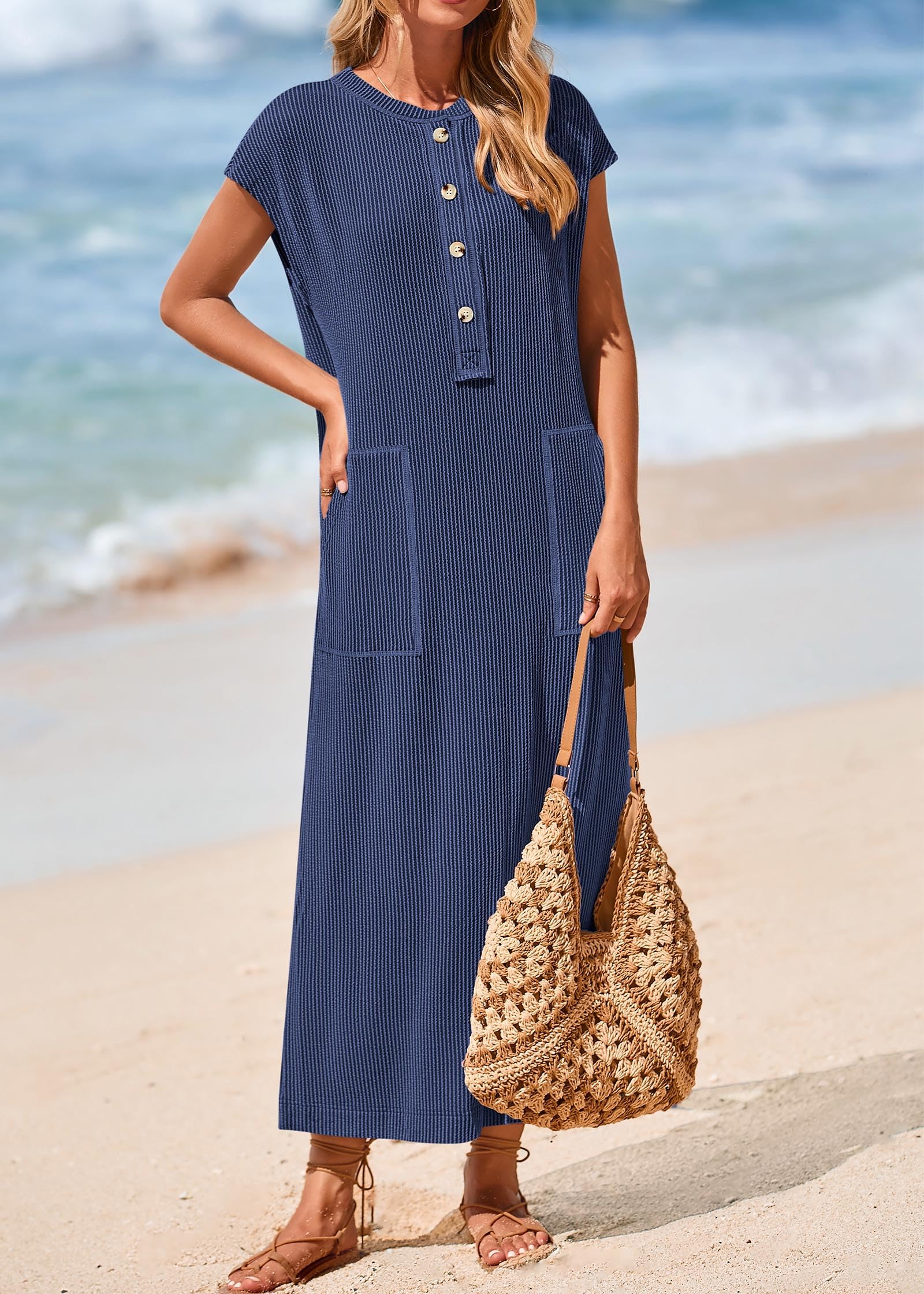 Guenda Manzo™ Pletené maxi šaty s krátkými rukávy a knoflíky