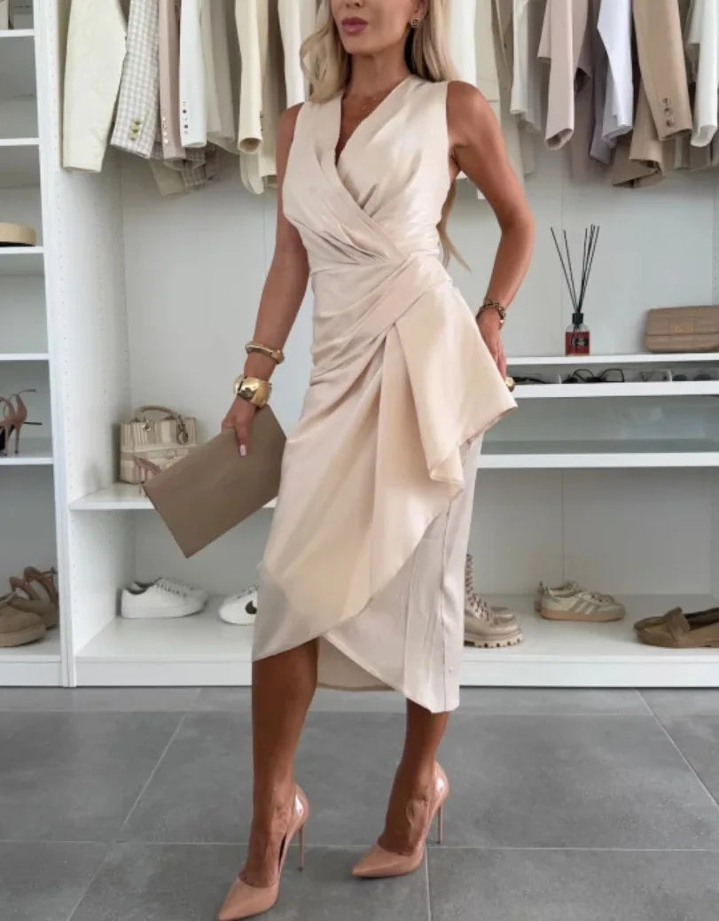 Díky jemnému výstřihu do V, který je akorát tak hluboký, aby lichotil, aniž by odhaloval příliš, je to typ výstřihu, který vždy sklízí komplimenty. Nerovný lem dodává šatům zábavný nádec. Materiál mu dodává hladký, luxusní lesk, který odráží světlo a krásně splývá.