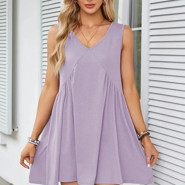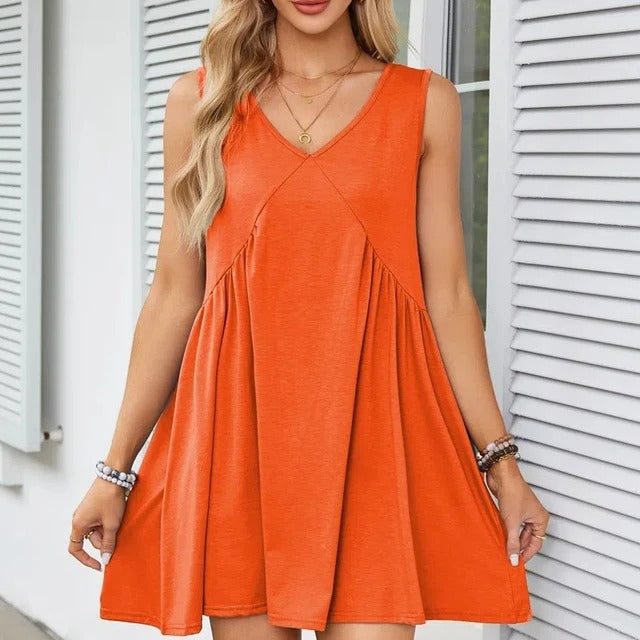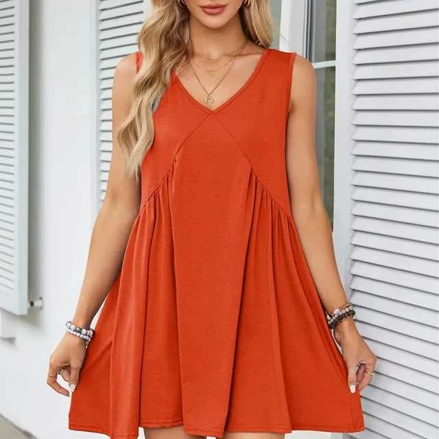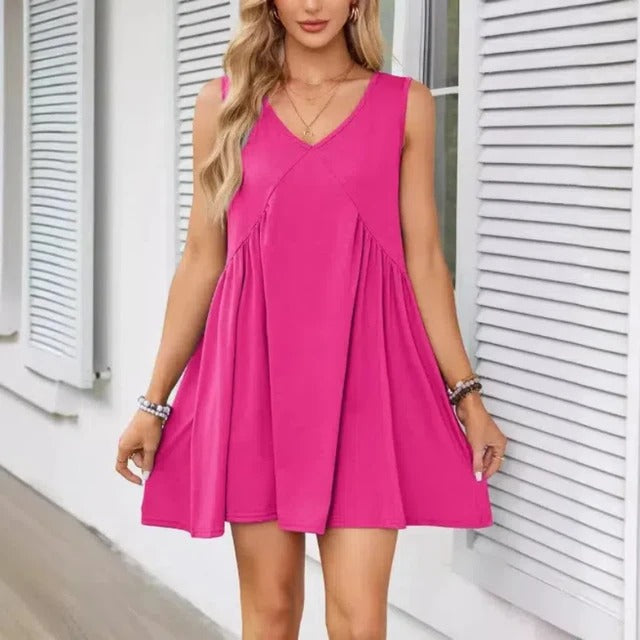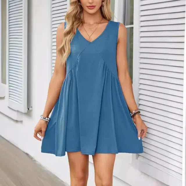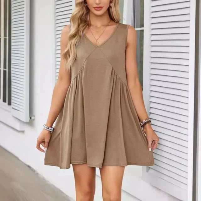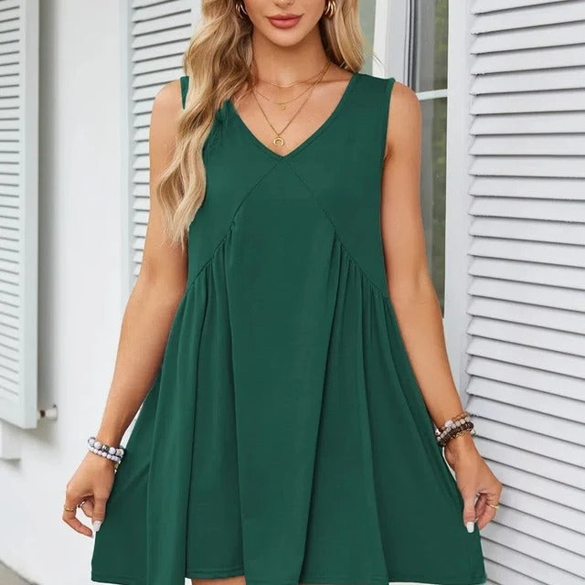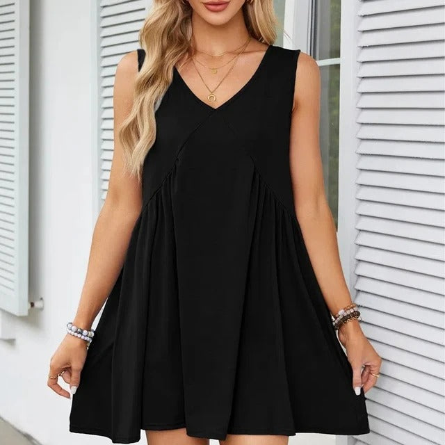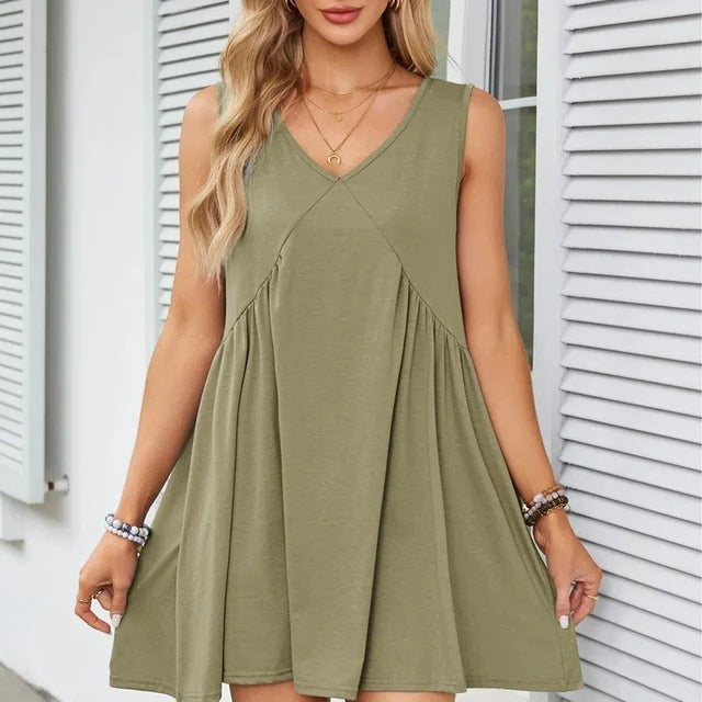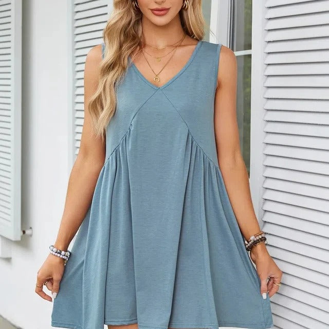 Vklouzněte do nenucené sofistikovanosti, která oslavuje vaši krásu a posiluje sebevědomí. Tyto šaty bez rukávů s výstřihem do V a sklady jsou pečlivě navrženy tak, aby lichotily vaší postavě a zároveň poskytovaly lehké a vzdušné pohodlí ideální pro teplé dny. Ať už okouzlujete přátele při brunchi, objevujete nová místa nebo si užíváte slunce, v těchto šatech se budete cítit sebevědomě, pohodlně a přirozeně úchvatně. Obohaťte svůj šatník o nadčasový kousek, který plynule přechází z ležérních dnů do elegantních večerů.