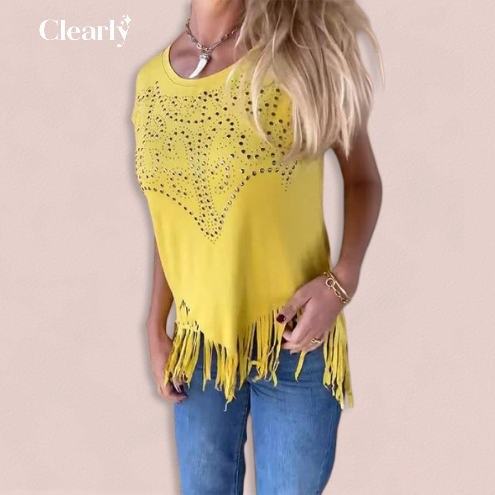 Nenuceně pozvedněte svůj každodenní look s tričkem, které mistrně spojuje pohodlí, styl a nenápadný dotek glamouru. Lesklý hot stamping detail zachytává světlo při každém vašem pohybu, zatímco hravé třásně dodávají osobitost i těm nejjednodušším outfitům. Vyrobeno z měkké a prodyšné látky, která vás udrží svěží i v nejteplejších dnech, a skvěle poslouží i při vrstvení na chladnější večery. Tento top se stane vaším nepostradatelným společníkem – když chcete vypadat okouzlující a zároveň se cítit dokonale pohodlně.