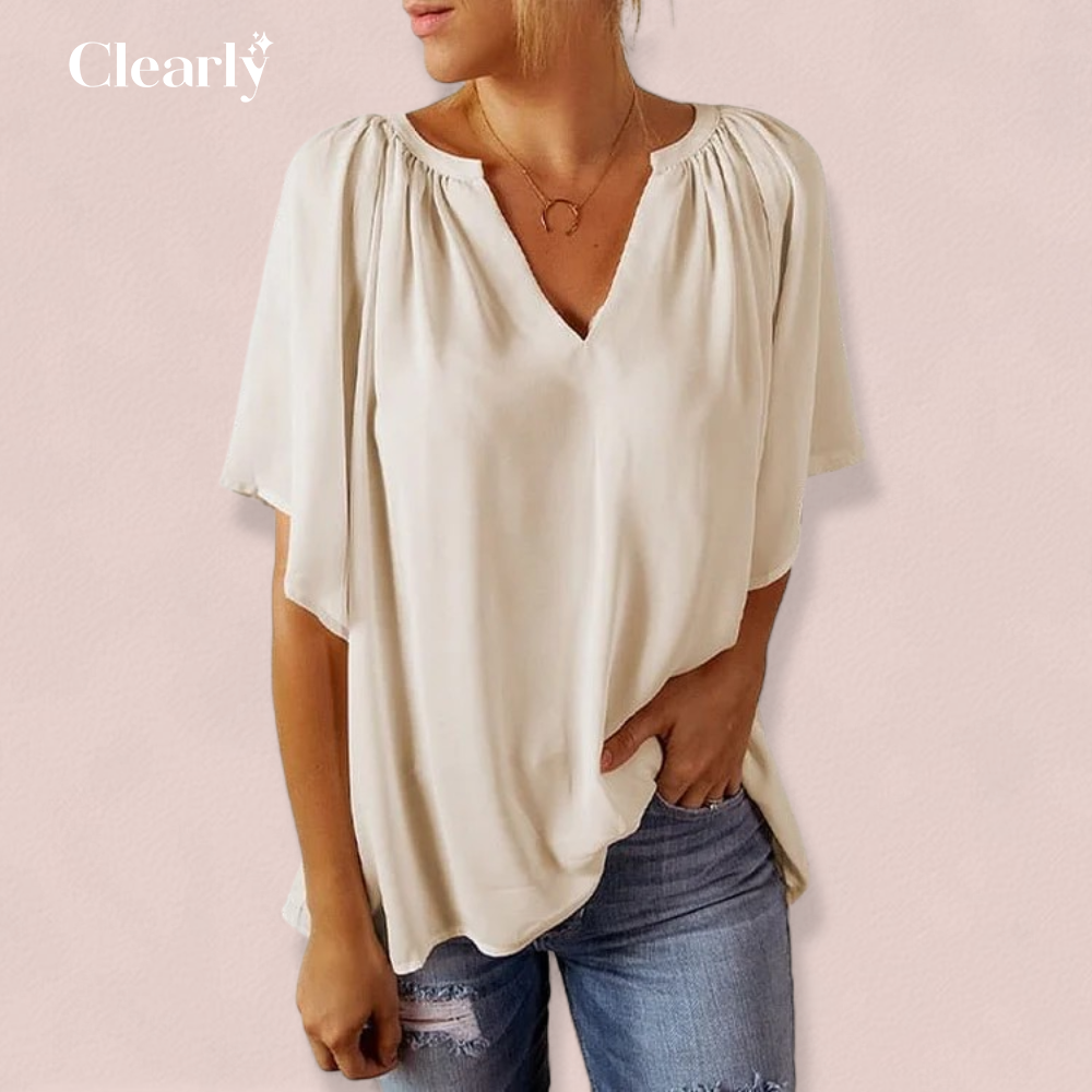 Díky lichotivému výstřihu do V a elegantním netopýřím rukávům působí tento top stylově a nenuceně. Je vyroben z měkkého materiálu, je prodyšný a lehký – ideální pro udržení chladu v teplých dnech, přičemž stále vypadá elegantně a upraveně.